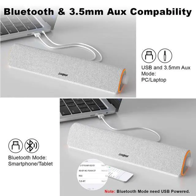 Aux Mode: Plug into a USB port for power, then press the "M" button to select "AUX Mode"you can now use the 3.5 mm jack to connect to audio devices. Compatible devices include PCs, desktop computers, laptops, tablets, and smartphones.