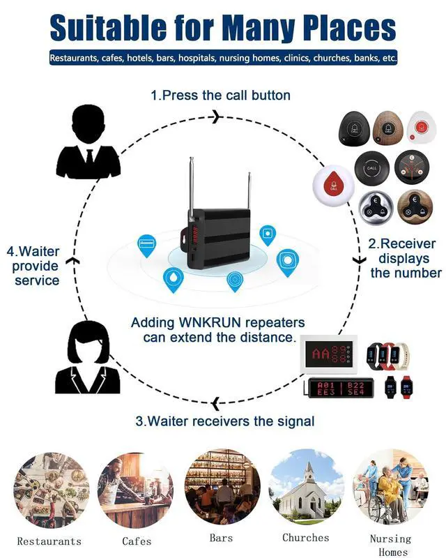 The button needs to be paired with the receiver then the unit can work. ^^ The wireless call button works with WNKRUN's receiver!!! ^^ The smart wireless nurse call button allows a patient or an elderly to press a button requesting assistance. ^^ Wireless call buttons with pager for restaurants, coffee, shops, and hospital service alert. ^^ Each call button comes with a lanyard.