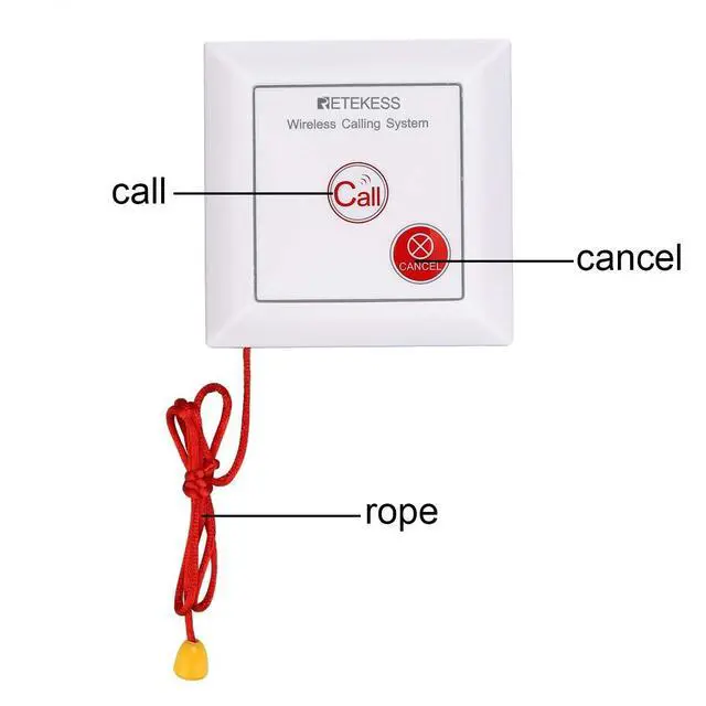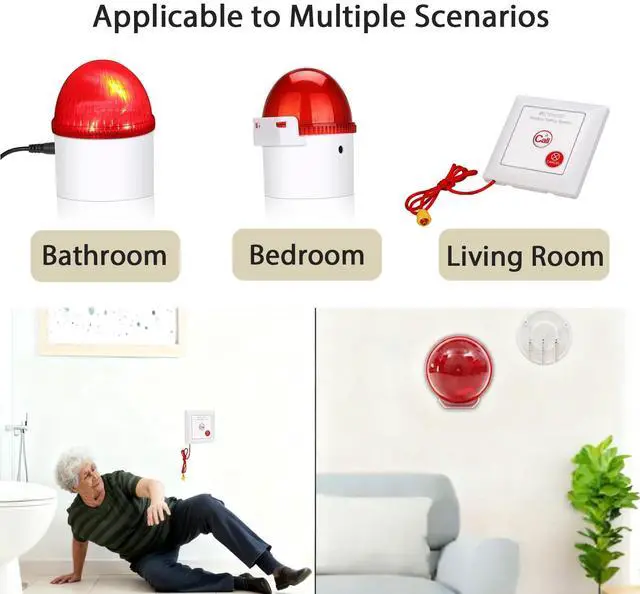 3 levels of volume control; mute mode; low volume and high volume modes can be set; suitable for different environment ^^ Fast emergency call; just to press the call button or pull the about 27.5 in length rope; receiver is flashing and beeping; simple and convenient ^^ Match with other products; can use with watch receiver; more convenient to receive the distress signal of elderly; please note that the alarm only works when connected to the power supply and will not work when unplugged ^^ Waterproof call button; alarm sounds when the button is pressed or the cord is pulled down; loud 110 decibel alarm; it can be used not only for home but also for classroom; warehouse; office; business ^^ Range up to 164-262ft in open area; caregiver pager is useful upstairs and downstairs in a house; walls or other objects may decrease operating distance