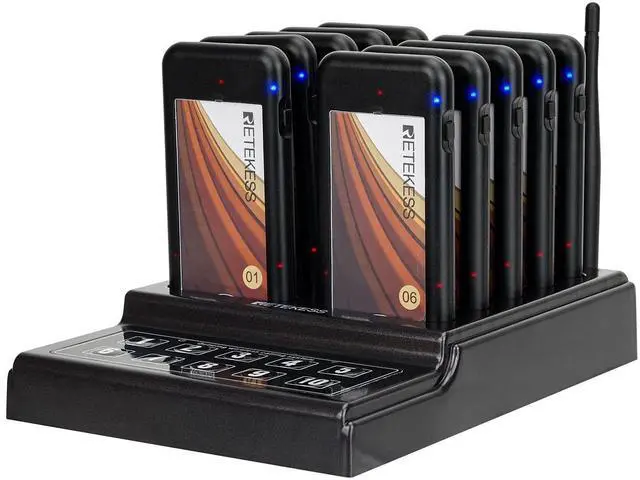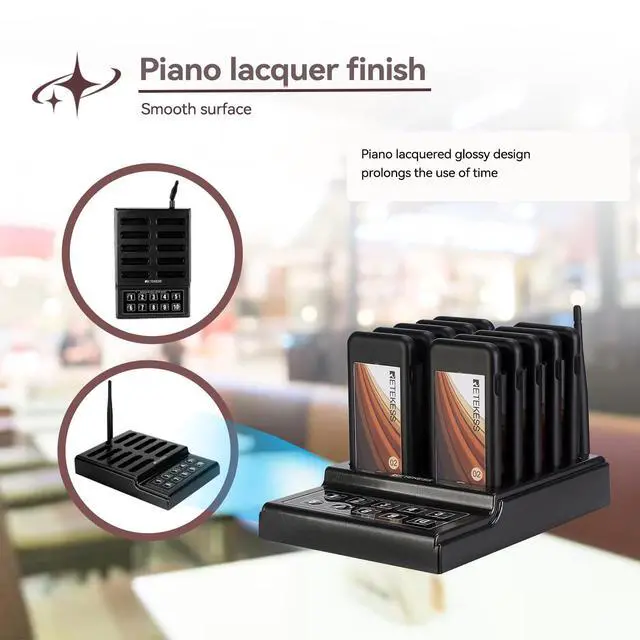 3 prompt modes; table pager system; vibration and buzzer and LED; vibration and LED; buzzer and LED; battery status and low power indication; vibration can be well used in church nursery not to disturb the church service ^^ Long range; order buzzer working distance is up to 1640ft in the open area; 492ft in building; standby current of pager is 10mA; restaurant buzzers system built-in 200mAh rechargeable battery; standby about 15-20 hours ^^ Change registration number of each order ready buzzer from 0 to 10; ID setting for keyboard; so 2 or more keypads can call the same pager simultaneously; 2 or more pagers can be paired to 1 same number; 1 pager also can be matched with 2 or more numbers; Simple pairing and easy operation ^^ Lanyards hole design for each food buzzer; easy for waiter to wear; pagers for restaurants can minimize the crowds in the queue; widely used for restaurant, food court, hotel, hospital; church; stock; kitchen food truck; etc ^^ Please don't use the staff paging system on the metal desktop or marble desktop, which will block the stability of signal transmission; If you don't use it for a long time; please charge the plate every 3 months