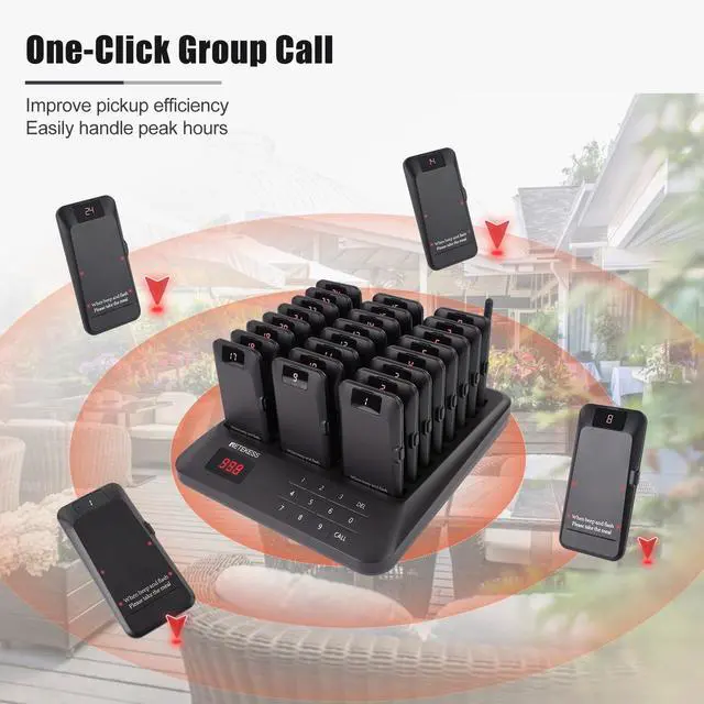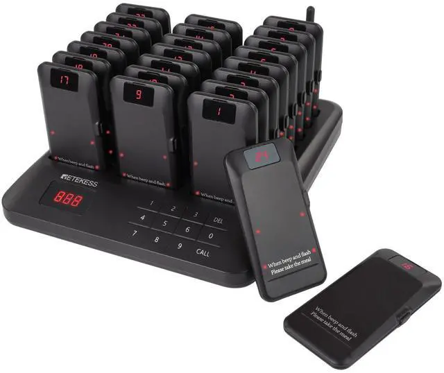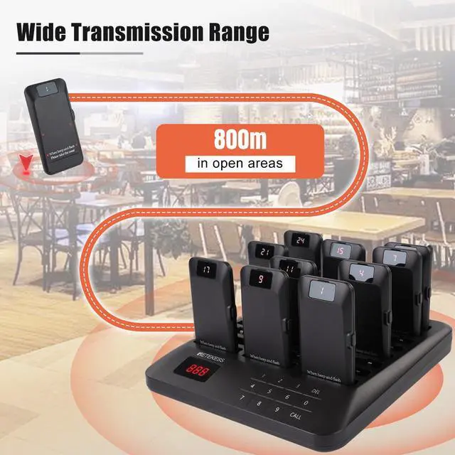 Personalized alerts; the pager can be set to vibration/buzzer/lightcustomize your alert settings of restaurant pager to perfection with 39 unique combinations; whether you prefer subtle vibrations or bold flashing lights; the choice is yours ^^ Long Range; enjoy extensive coverage without limits; restaurant beeper buzzer boasts an 800m operating range; tested under open and unobstructed conditions; right for large spaces and outdoor applications ^^ One touch mute; some customers may prefer silent alerts, especially those who are sensitive to sound; and the mute function of the restaurant beeper system can provide a more comfortable experience ^^ Boundary crossing alert; restaurant pager system buzzer is equipped with an advanced over boundary alert feature; when a pager is taken beyond the set perimeter; it automatically triggers an alert; helping to prevent lost or misplaced devices ^^ Long-lasting efficiency; 300mAh rechargeable lithium-ion battery can ensure 24 hours of use; provide reliable and stable power supply to keep paging system running smoothly