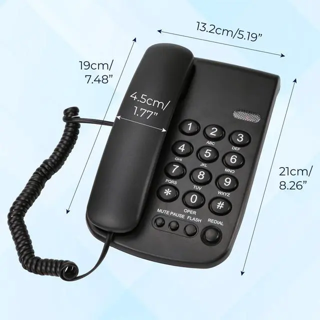 Multi-Function Operation This corded landline phone includes essential features such as Mute, Redial, Flash, Pause, and P/T dual mode for efficient call management. The elastic handset cord and anti-slip base enhance usability, making communication smoother and more comfortable during long calls. ^^ Adjustable Handset & Ringer Volume Easily customize both the conversation and ringer volumes to your preference. The phone features LO and HI volume options for clear sound in any environmentensuring calls are always audible, even in busy offices or noisy households. ^^ Durable Construction Built from high-quality ABS plastic, this landline phone offers exceptional durability, wear resistance, and stability.