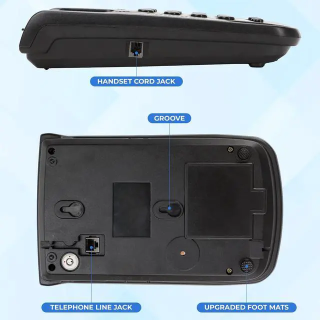 The silicone non-slip pads prevent slipping and sliding, maintaining a neat and secure setup on any desktop surface. ^^ Plug-and-Play Installation No batteries or external power required. Simply connect the phone line to start using immediately. Designed with a wall-mount groove at the bottom, it can be conveniently placed on a desk or mounted on the wall to suit your space. ^^ Versatile Use for Multiple Settings The TCF 2000 corded landline phone delivers crisp, distortion-free audio with built-in noise reduction technology. With its professional design and user-friendly interface, this phone is perfect for homes, offices, hotels, hospitals, and front desks.