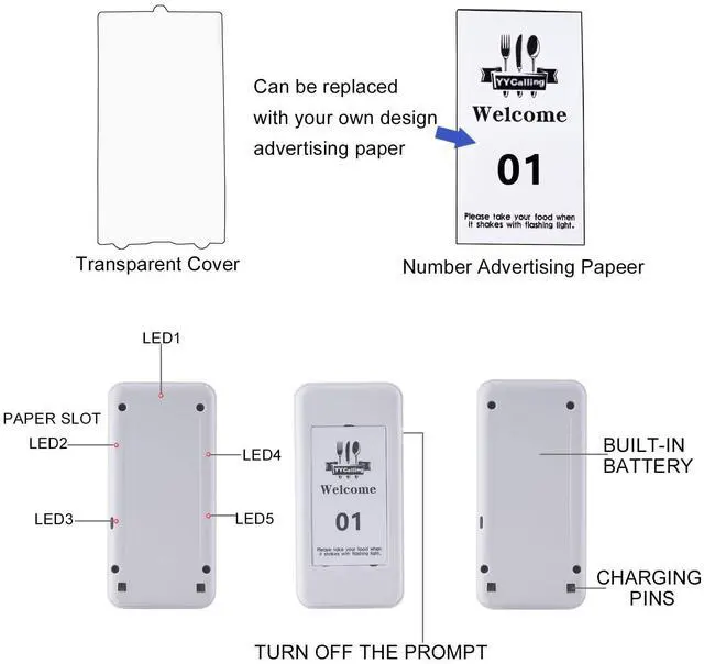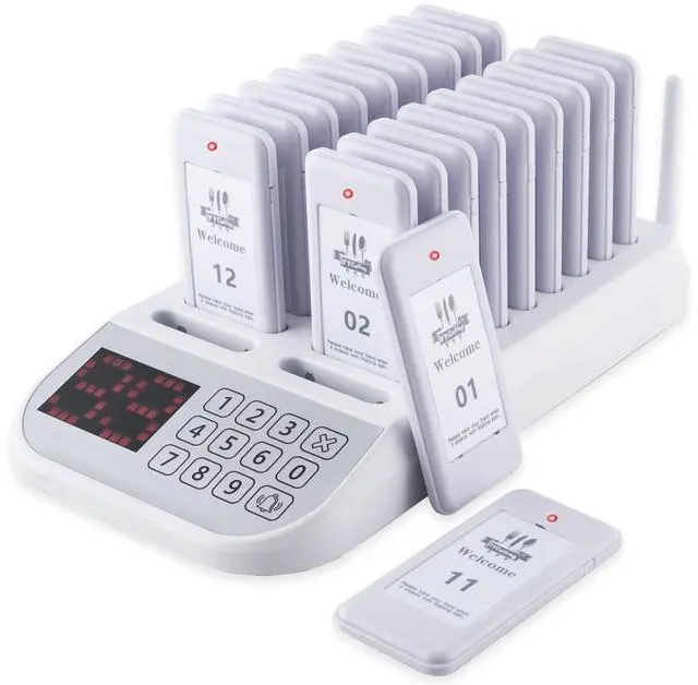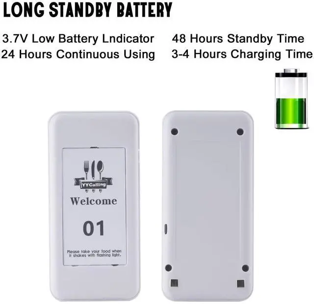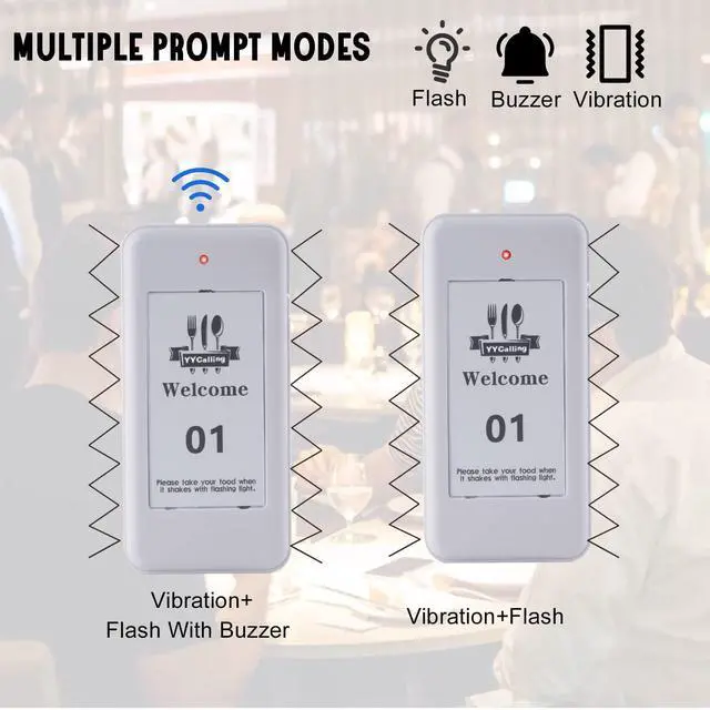 YYCALLING Wireless Calling SystemBased on 315MHZ radio-frequency, the indoor transmission distance is 984-1640 feet, and the open area can transmit up to 3280 feet/1000 meters, which can effectively reduce close contact and provide better safety protection measures for your employees, customers, and patients ^^ Calling Modes2 changeable modes for restaurant paging system are vibration + flash + buzzer and vibration + flash, meeting different occasions. ^^ Rechargeable Battery 20 charging slots provide power whenever you put the pager on the base, so you don't have to worry about running out of power.