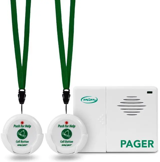 Product DescriptionSmart Caregivers wireless fall alarm system alerts caregivers when patients press the call button, sending a sound alarm to the included pager. Setup is easy; place the call button on a flat surface or mounted to a wall or have the patient wear it with the included lanyard for rapid response. This paging alarm system includes a wireless caregiver pager with an on/off switch and two alert tones to choose from. With a range of up to 300 feet, our elderly monitoring alarm gives caregivers the ability to take care of other tasks while in a different room, making it a valuable part of your elderly assistance products.