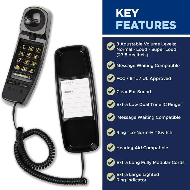 ^^ VERSATILE AND RELIABLE: A versatile communication solution suitable for various settings. Its wall-mountable design adapts to different room configurations, and it is compatible with hearing aids, catering to users with hearing assistance devices. Constructed from high-impact ABS plastic, it offers robust durability, ensuring a dependable communication tool for hotels, restaurants, and beyond. Elevate your communication experience with the T4 Trimline Telephone from Med-Pat! ^^