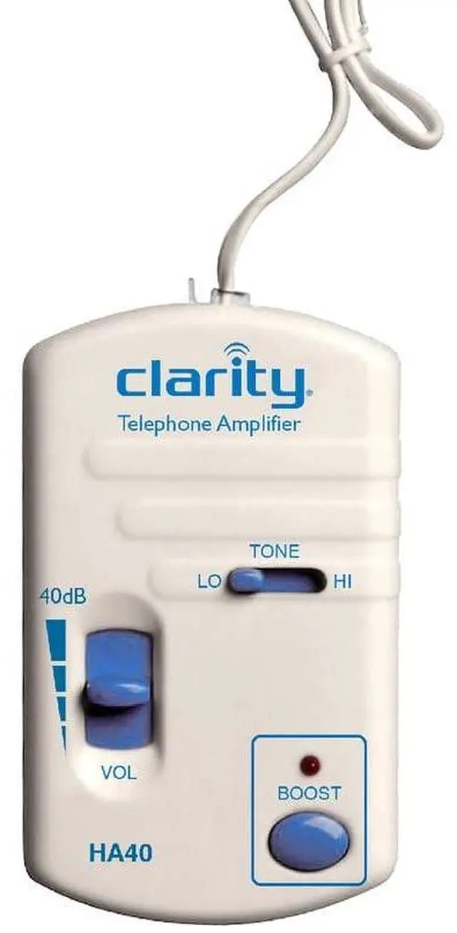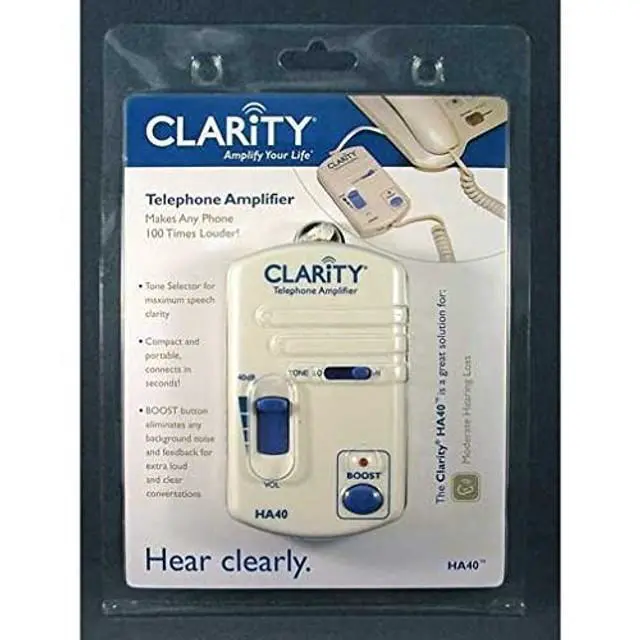The Clarity HA40 Portable Telephone Handset In-Line Amp is a great, easy solution to modify phones that have a handset separate from the keypad so they are more hearing-friendly. It easily installs between the handset and the base and will increase incoming sounds up to 40 dB! It also has an adjustable tone control to help distinguish between similar-sounding words like "chair" and "share" as well as a boost button that mutes the microphone in the handset to eliminate background noise and feedback. Because of its small size, this easy to use telephone amplifier is ideal for traveling, as well as at the home or office.