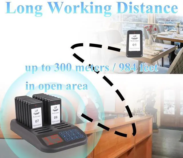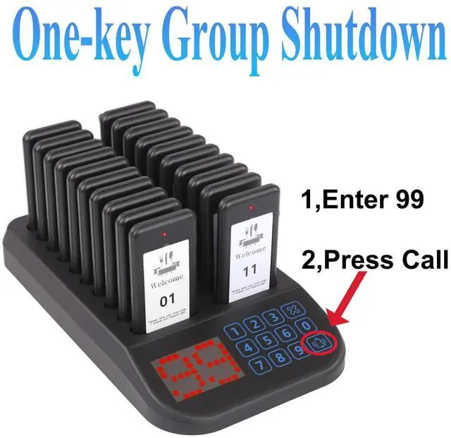 Replaceable stickers: every restaurant buzzers can replace photos on pagers and place your custom logo. ^^ Rechargeable Battery - Each receiver features a built-in 3.7V /200mAh rechargeable battery with a stacked charging design, eliminating the need for frequent battery changes. With a full charge, the receiver can work frequently for at least 20 hours. ^^ One-Touch Group Shutdown Instantly power off all pagers on the charging base by entering 999 + press CALL. Pagers must be pre-paired with the transmitter ^^