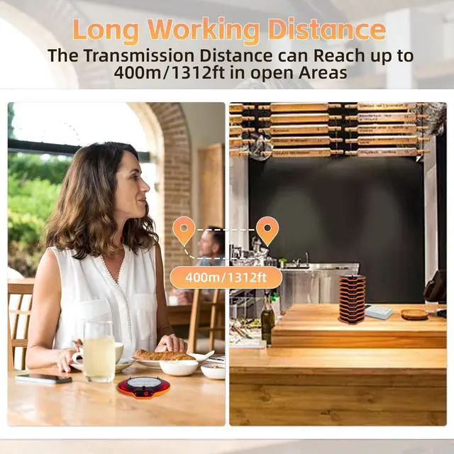 Comes with 24 buzzers and dual charging bases, each base charges 12 buzzers, ensuring all devices stay ^^ Full Touch Keypadour restaurant paging system features a separate wireless call pad, giving you more placement flexibilityon the counter, wall, or handheld ^^ Versatile UseThe restaurant waiting buzzers has a range of about 300 feet indoors and 1, 000 feet outdoors. Ideal for a wide range of applications, including restaurants, food trucks, coffee shops, clinics, and churches