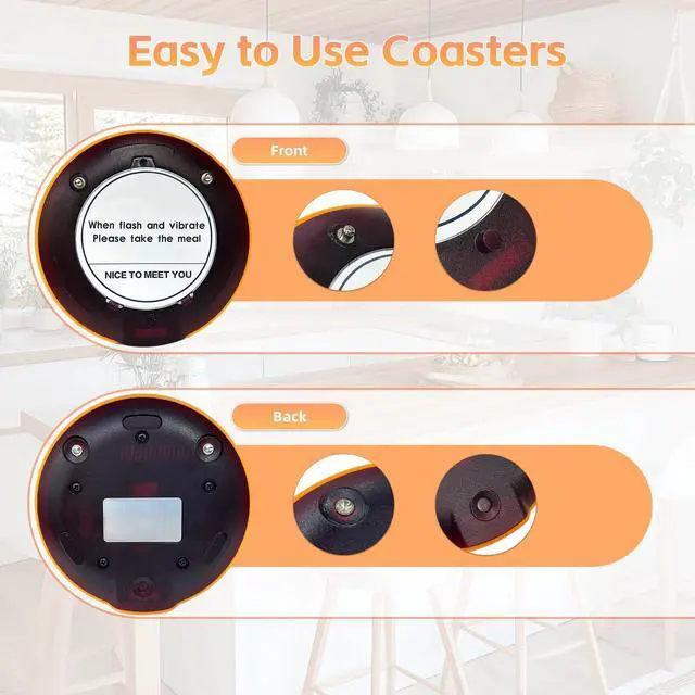 Easy To Use and SetupThe buzzers for restaurants are of a simple, compact design, conveniently portable, and easy to operate, the only requirement being a mains power supply. Pre-Paired for Instant Use Zero Setup Required ^^ 24 Pagers with Rubber Protection Each pager for restaurants features a durable and break-proof design with rubber protection that absorbs impacts, preventing damage from drops, collisions, or daily wear and tear in fast-paced kitchens and dining areas ^^ Adjustable Notification ModeOur restaurant buzzer system with dual alert modes (Vibration+Buzzer+Flash or Vibration+Flash) and adjustable alert duration (1-250 Seconds), providing unmatched flexibility to match your business operations ^^ Rechargeable Coaster BeepersThis pagers for restaurants have a built-in rechargeable battery for long-lasting use.
