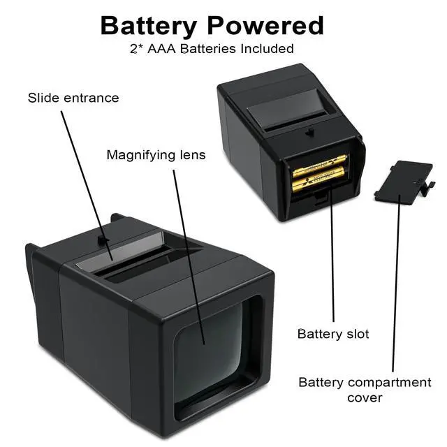 ^^ Easy to Use: The viewer is battery-powered, so it's easy to use wherever you are. Simple to operate, install 2 AAA batteries (included), insert the slide and turn on the LED switch to activate the slide viewer.