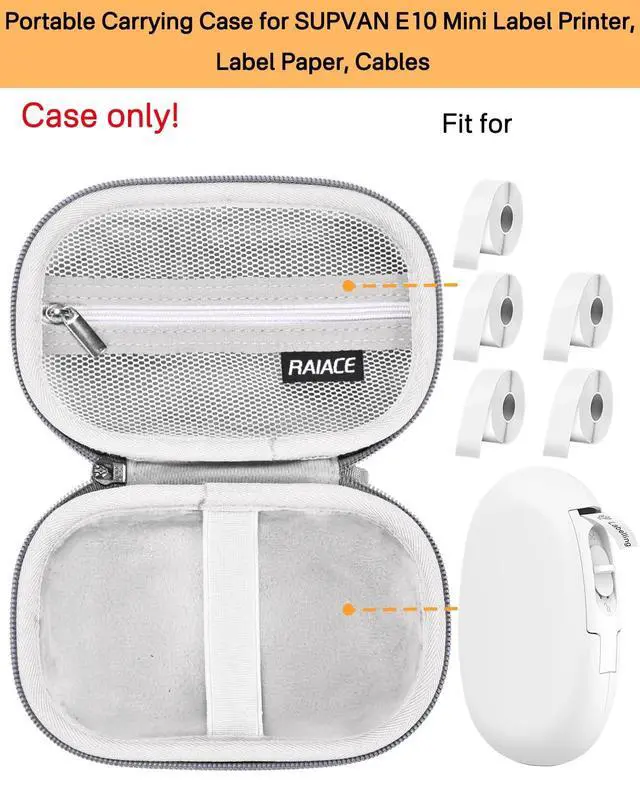 Great FitHard case compatible with SUPVAN E10 Mini Label Printer. (Case ONLY! Device and its accessories are NOT included). ^^ Great Quality Materials - Extra soft, anti-static, shockproof layer and fluffy fabric inner layer, the product can effectively absorb impacts and reduce damages caused by accidentally bumping. Hard EVA case protect your device from accidental impact of bumps and drops, waterproof, shockproof and anti-scratch. ^^ Convenient Design - Built-in a mesh pocket for label paper, cables and accessories. Elastic band can holds your Label Printer in place.