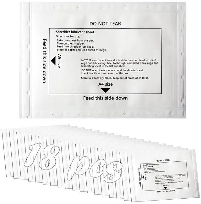 Sheet Size: 8.4 * 6nch (213 mm x 151 mm). ^^ Formula uses natural, - Shredder oil sheets made with vegetable oil and recycled paper. ^^ Paper shredding oil sheets easy to use, just like shredding a piece of paper quickly. no oil, no mess. ^^ 18 pcs paper shredder lubricating sheets, cleans, and lubricates shredder blades.