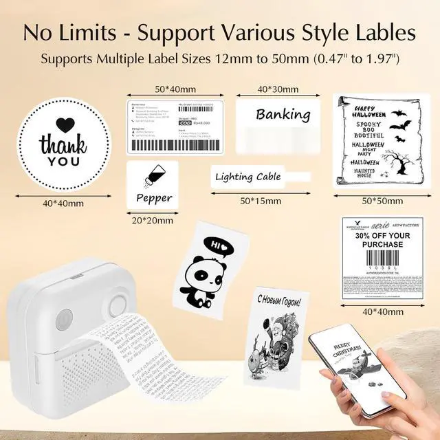 Compatibility: Handles 12-50mm widths ideal for sticker printer machine versatility. Use affordable third-party rolls to print on cables, jars, retail tags, or machinery parts ^^