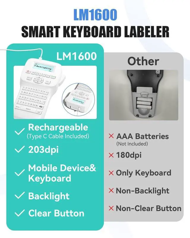 Backlit LCD Screen: The LM1600 label maker machine features an upgraded LCD screen with 25% improved clarity, ensuring easy readability in any environment. This handheld label maker allows for accurate typing and previewing of labels, making it a reliable office label maker and industrial label maker. The enhanced display supports precise editing for various applications, including waterproof label maker tasks and cable label maker projects, providing a clear view of every detail before printing ^^ Compact and