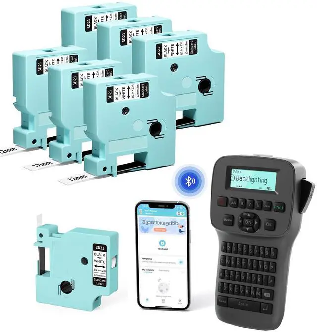 • LABEL MAKER MACHINE WITH TAPE - Handheld portable label maker LM1600 with 6 label tapes: LM1600 label maker x 1, black print on white-3D21 x 6, 1/2 inch x 23 feet (12mm x 7m) each