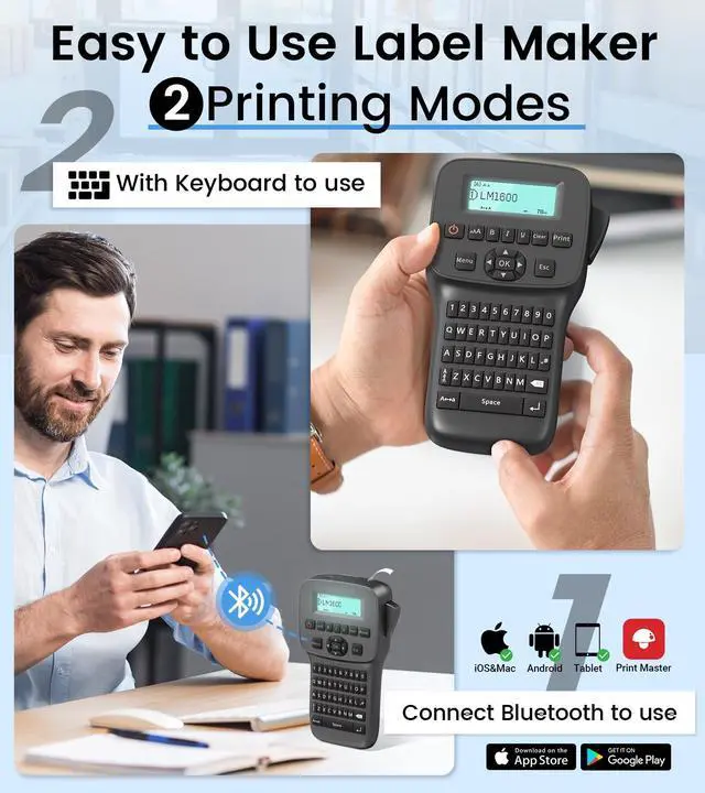 • KEYBOARD BLUETOOTH LABEL MAKER - Bluetooth label maker machine with multiple pre-templates/ fonts/ icons/ borders/ languages for Smartphone QWERTY keyboard label maker with built-in cutter for the elderly and children or outdoor workers in network-less environment LM1600 labeler with backlighting LCD Screen for dark environments Auto shrink ribbon function makes label less prone to jamming.