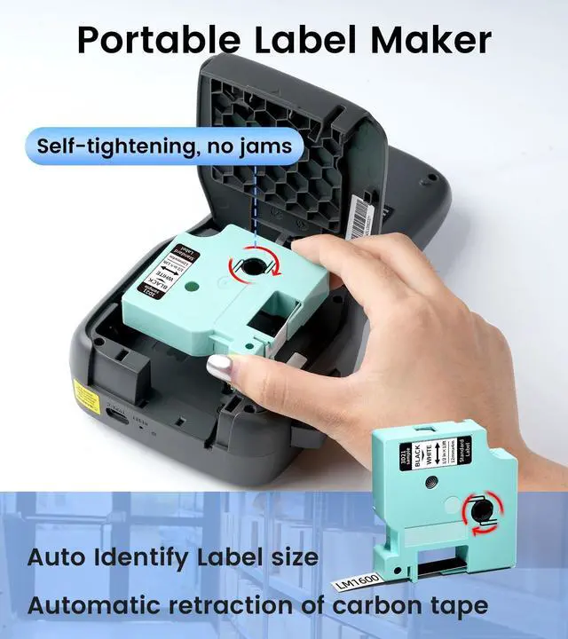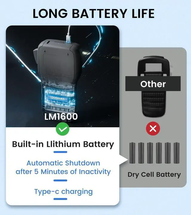 • RECHARGEABLE LABEL MAKER - Save money. You needn't spend more for ink, 6 AAA batteries and AC adapter. The industrial label maker built-in 1200 mAh high-capacity lithium battery charge for 2 hours, allow continuous printing of up to 50m tapes on full charge. LM1600 labeling machine comes with waterproof label maker tapes and Type-C cable.