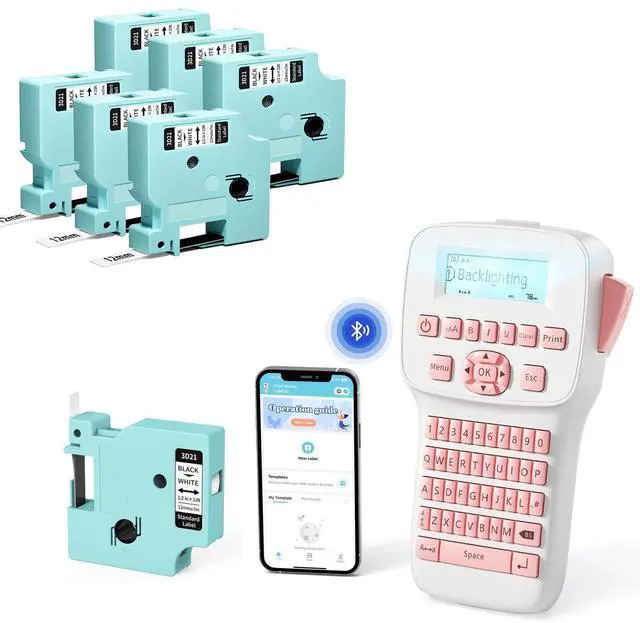 • LABEL MAKER MACHINE WITH TAPE - Handheld portable label maker LM1600 with 6 label tapes: LM1600 pink label maker x 1, black print on white-3D21 x 6, 1/2 inch x 23 feet (12mm x 7m) each