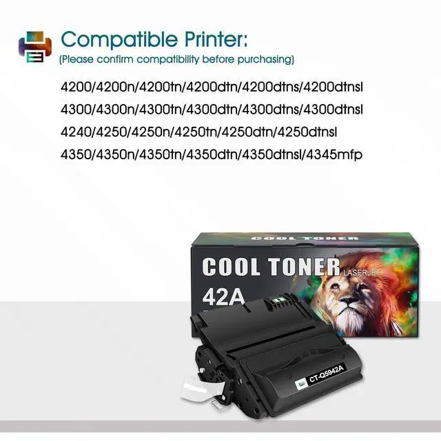 High Yield: 1, 0000 Pages (Black) Based on 5% coverage (Letter/A4) ^^ Compatible for HP 4200 4200N 4200TN 4200DTN 4200DTNS 4200DTNSL; 4240 4250 4250N 4250TN 4250DTN 4250DTNSL; 4300 4300N 4300TN 4300DTN 4300DTNS 4300DTNSL; 4350 4350N 4350TN 4350DTN 4350DTNSL 4345MFP Printer ^^ Include 1 Pack Compatible for HP 42A Q5942A (42X Q5942X) Black Toner Cartridge ^^ Easy to be installed and fully compatible with your printer
