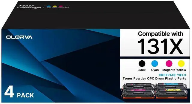 What's in the box: Total 4-Pack 131A 131X (CF210X CF211A CF212A CF213A) toner replacement for HP 131x toner cartridges. Package Includes 1 X 131X Black Toner Cartridge, 1 X 131A Cyan Toner Cartridge, 1 X 131A Magenta Toner Cartridge, 1 X 131A Yellow Toner Cartridge ^^ 2.