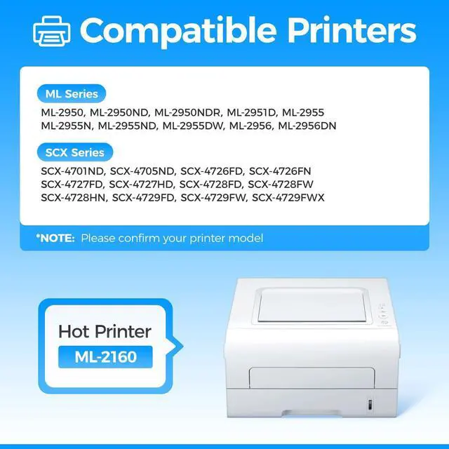 ^^ Compatible Printer: Compatible with Samsung ML-2950, ML-2950ND, ML-2950NDR, ML-2951D, ML-2955, ML-2955N, ML-2955ND, ML-2955DW, ML-2956, ML-2956DN, SCX-4701ND, SCX-4705ND, SCX-4726FD, SCX-4726FN, SCX-4727FD, SCX-4727HD, SCX-4728FD, SCX-4728FW, SCX-4728HN, SCX-4729FD, SCX-4729FW, SCX-4729FWX Series Printers.