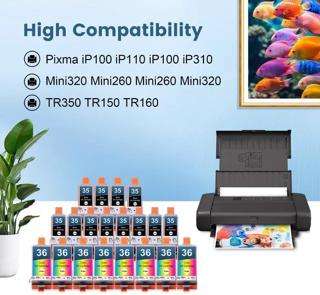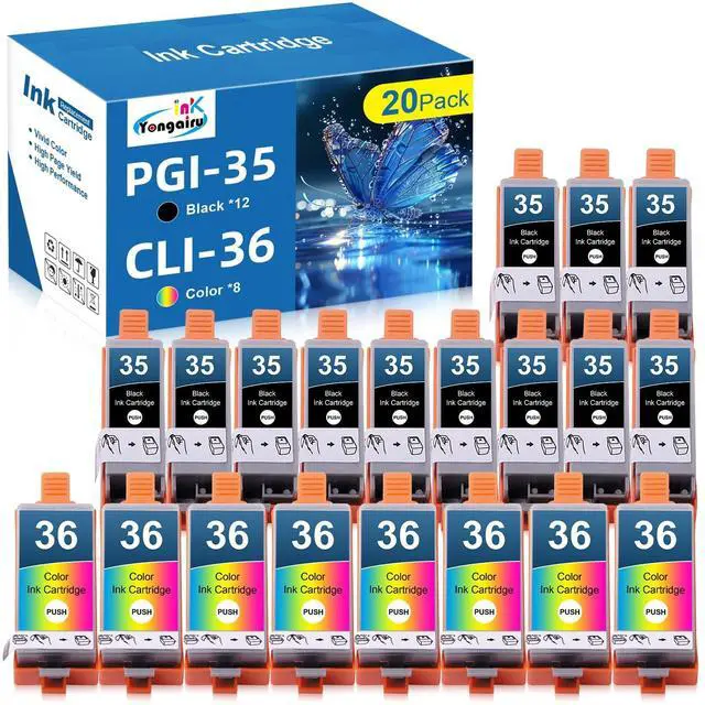 Packing List20 Pack PGI-35 CLI-36 black cyan magenta yellow ink cartridges replacement for canon pgi35 cli36 ink (12 x PGI35 Black, 8 x CLI36 Tri-Color). ^^ PGI35 CLI36 Ink High CompatibilityCompatible for Canon iP100 iP110 Mini260 Mini320 TR150 TR160 Printers. ^^ PGI-35 CLI-36 High Page YieldPGI 35 black is 200 pages per cartridge, CLI 36 tri-color is 260 pages per cartridge. (at 5% coverage of A4 paper). ^^ Strict Test and High QualityEach Yongairuink pgi35 cli36 ink cartridge undergoes a strict quality control process to ensure lightfast and vivid colours. The latest updated chips and perfect compatibility help you effectively capture important moments at work, study and in life.