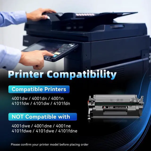Printer Compatibility: HP 4001dw 4001dn 4001n 4101fdw 4101dw 4101fdn printer, NOTE: NOT COMPATIBLE WITH 4001dwe 4001dne 4001ne 4101fdwe 4101dwe 4101fdne ^^