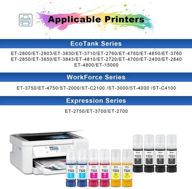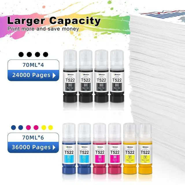 Huge Printing Power: This set includes two full packs of T522 ink refill bottles10 bottles in total. With a page yield of up to 60, 000 pages, youll have plenty of ink to handle all your printing needs without worrying about running out.