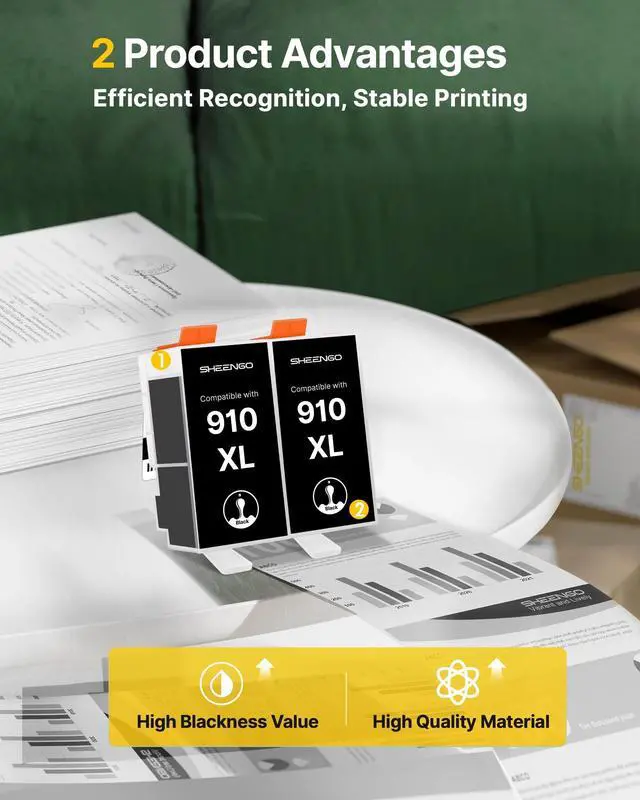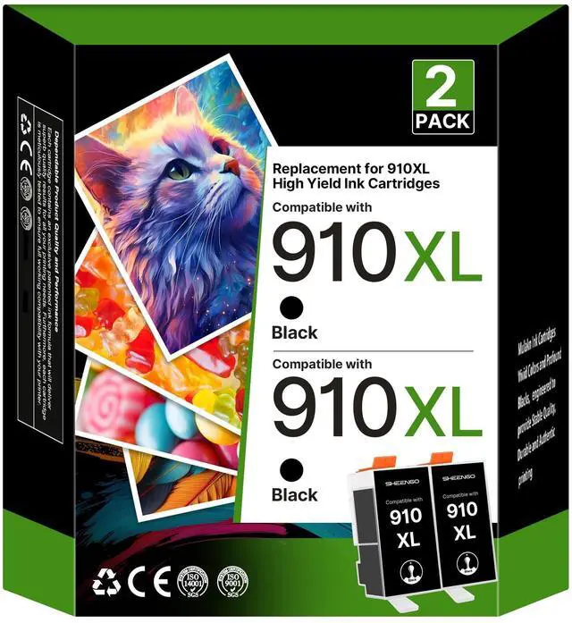 High Page Yield: Each 910 xl black ink cartridges for hp printers delivers an impressive high page yield of up to 1, 200 pages (based on 5% coverage of A4 paper) ^^ SHEENGO for HP 910 Black Ink Cartridge 910XL is engineered to work with your printers to provide consistent quality, reliability and value ^^ This is Not an OEM product, all 910XL ink cartridges are made in an ISO 9001 and ISO 14001 certified facility, we provide 24 months warranty and 100% satisfaction guarantee and free replacement of defective ink cartridges! If you have any issues, please contact us, we offer 24 Hour Online customer service