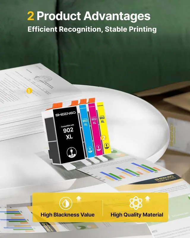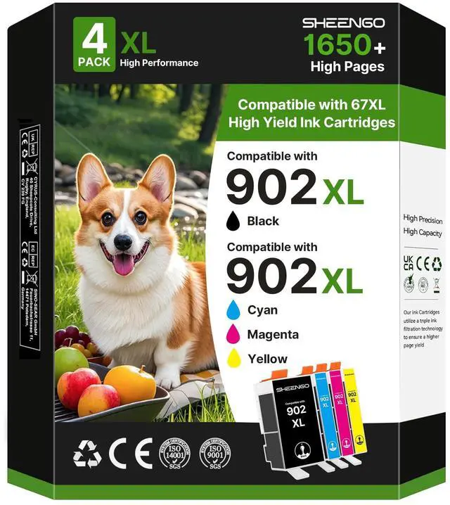 Inkjet Printer ^^: Up to 825 pages each for HP 902XL Black Ink Cartridge and 825 pages each 902 902XL color ink cartridge, totally 3300 pages for printing5% coverage of A4 ^^ for HP ink 902XL black and color combo pack equipped with the latest chip to ensure 902XL fully compatible with your printer ^^: Outstanding reliability, easy to install and use. Free replacements 902 XL for HP ink cartridges combo pack will be sent if there're any quality issues within 2 years warranty ^^ SHEENGO 902 ink cartridges for HP printers is engineered to work with your printers to provide consistent quality, reliability and value