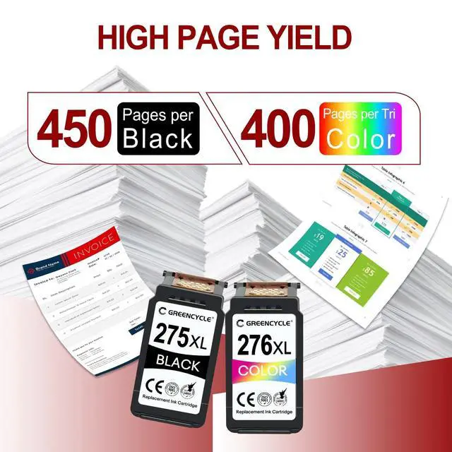 ^^ High Page Yield: Up to 450 pages for canon 275xl black ink cartridge and 400 pages for canon 276xl color ink cartridge At 5% coverage. It is the high capacity option of 275 and 276 ink cartridges.