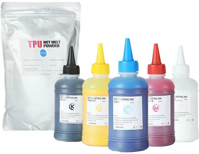One Order Whole Set: Premium DTF ink set includes 250ml bottles each of Cyan, Magenta, Yellow, Black, White inks, plus 500g of TPU hot melt powder for transfers ^^