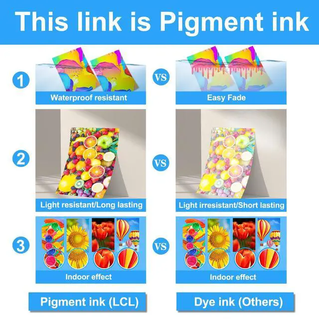 Pigment Ink: LCL 970XL 971XL is pigment ink which has a high concentration and contrast, and is an ink that can draw fine characters clearly without color infiltration. Pigment inks are waterproof and light resistant and do not fade even when outdoors, thus allowing prints to last long enough.