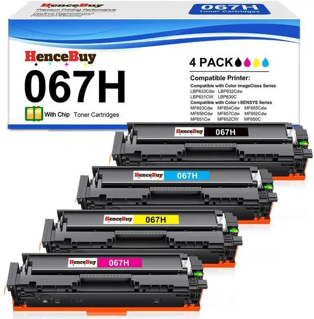 Product ModelHenceBuy compatible 067H 067 toner cartridge set high yield replacement for canon 067H toner cartridge set, for canon mf656cdw toner cartridges, canon mf654cdw toner cartridges ^^ Compatible Printers067H Toner Cartridge Set Compatible for Canon imageCLASS MF656Cdw LBP632Cdw MF654Cdw MF653Cdw LBP633Cdw LBP631Cw MF651Cw MF656Cdw MF650C MF652Cdw MF652Cw LBP630C MF657Cdw MF655Cdw laser printer ^^ High Page Yield3, 150 pages per 067H black toner cartridge, 2, 350 pages per 067H color C/M/Y toner cartridge (at 5% coverage of A4/letter paper) ^^