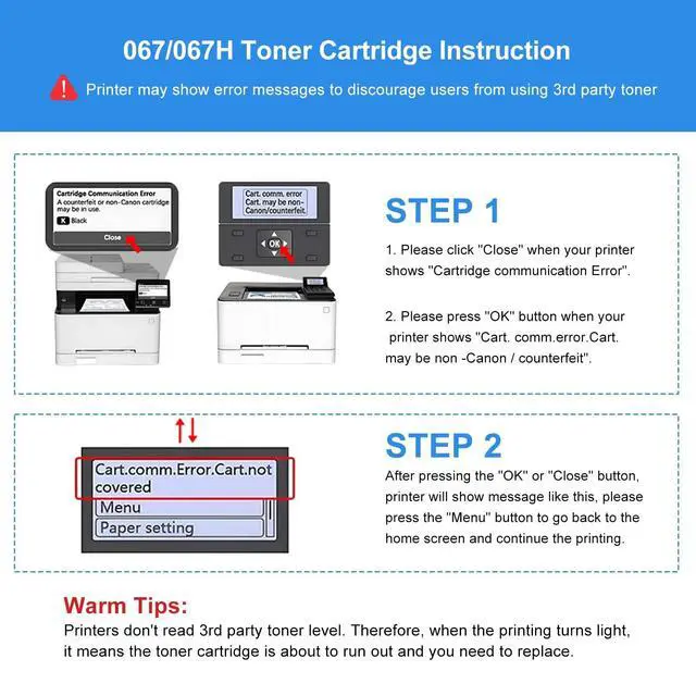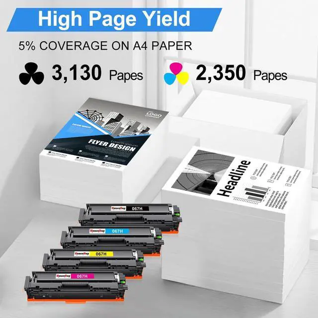 Package Contents: 4 Pack 067H Toner Cartridge replacement for Canon 067H 067 Toner Cartridge High Capacity, including 1 x 067H black toner cartridge, 1 x 067H cyan toner cartridge, 1 x 067H yellow toner cartridge, 1 x 067H magenta toner cartridge, Each color imageclass mf656cdw toner with robust packaged to ensure safety and integrity ^^ Enhanced ProductivityHenceBuy 067H Toner Cartridges ensure maximum printer uptime, allowing you to print large volumes of documents without compromising on quality or performance. ^^ Printing PerformanceAll 067H 067 Toner Cartridges are strictly manufactured to ensure the premium print quality, which offers accurate colors and long-lasting texts, bringing every detail to life