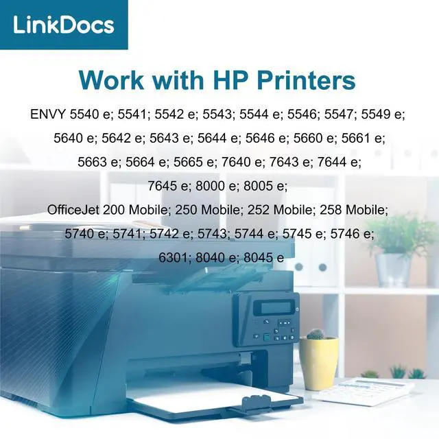 • Compatible with HP Printers: ENVY 5540e, 5640e, 5642e, 5643e, 5644e, 5646e, 5660e, 5661e, 5665e, 7640e, 7645e, 5543, 7643e, 5663e, 5664e, 7644e, 5542e, 5544e, 5549e, 5541, 5546, 5547, 8000e, 8005e, OfficeJet 200 Mobile, 250 Mobile, 252 Mobile, 258 Mobile, 5740e, 5741, 5742e, 5745e, 5743, 5744e, 5746e, 6301, 8040e, 8045e