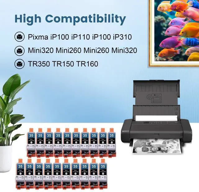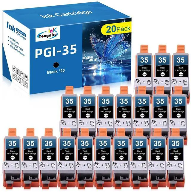 Packing List20 Pack PGI-35 black ink cartridges replacement for canon pgi35 cli36 ink (20 x PGI35 Black). ^^ PGI35 Ink High CompatibilityCompatible for Canon iP100 iP110 Mini260 Mini320 TR150 TR160 Printers. ^^ High Page YieldPGI 35 black is 200 pages per cartridges. (at 5% coverage of A4 paper). ^^ Strict Test and High QualityEach Yongairuink pgi35 ink cartridge undergoes a strict quality control process to ensure lightfast and vivid colours. The latest updated chips and perfect compatibility help you effectively capture important moments at work, study and in life. ^^ Reliable Printing PartnerYongairuink pgi 35 ink cartridges are designed to deliver outstanding, brilliant and lifelike images and clear documents to fulfil your various printing needs.