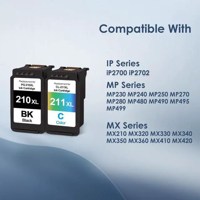 FOR CANON 210XL/211XL BLACK AND COLOR INK CARTRIDGES COMBO PACK COMPATIBLE PRINTERSPIXMA MP280 MP495 MP240 MP480 MP499 MP490 MP250 MP270 MX410 MX340 MX330 MX320 MX350 IP2700 IP2702 printers.
