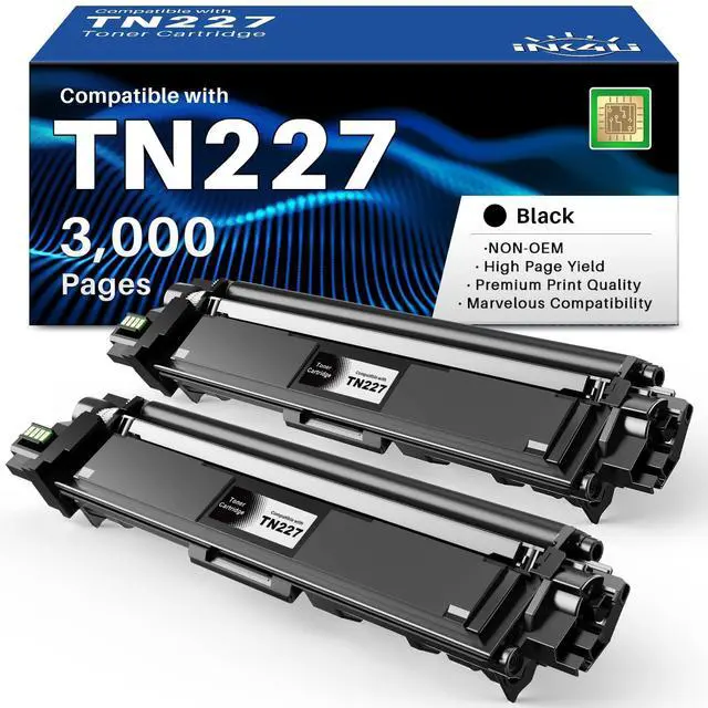 Product Item INK4U Compatible Toner Cartridges Replacement for Brother TN227 TN223 TN227BK TN223BK Toner Cartridges, 2 Pack, Non-OEM ^^ With Latest Upgraded Chip These compatible TN-223 TN-227 black toner cartridges are equipped with the latest upgrade chip, supported by ISO9001 and ISO14001 factory standards. ^^ Compatible PrinterWork for HL-L3210CW HL-L3230CDW HL-L3270CDW HL-L3290CDW MFC-L3710CW MFC-L3750CDW MFC-L3770CDW Printers ^^ Product Content2 x TN223 TN227 Black Toner Cartridges ^^ Larger CapacityUp to 3, 000 pages per TN-227BK Black toner (at 5% coverage of A4 paper)