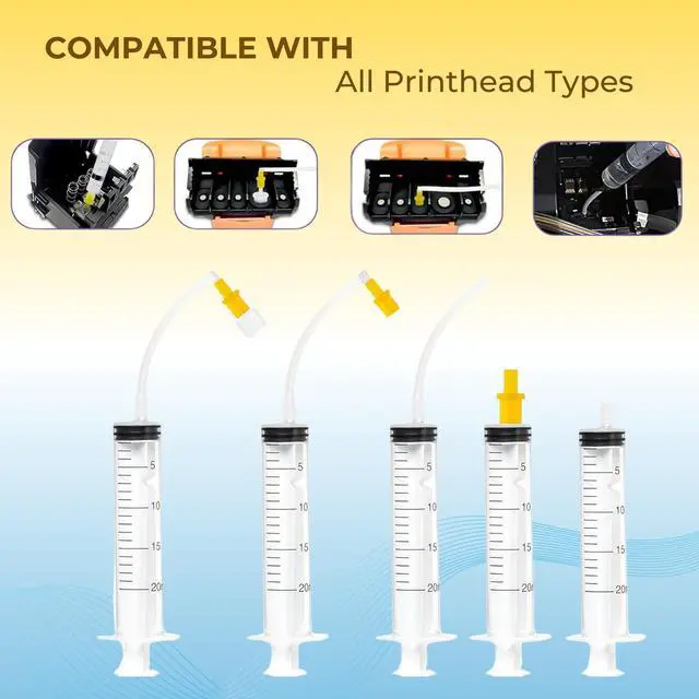 CLEANING KIT INCLUDED: Everything you need in one package: 250mL ( 8.45 oz) cleaning solution bottle, precision syringe, silicone tubing, 2 white nozzles, 1 yellow nozzle (fits Epson ink ports perfectly), L-shaped tube, and foam swab. No extra purchases needed - start cleaning immediately. ^^ UNIVERSAL COMPATIBILITY -