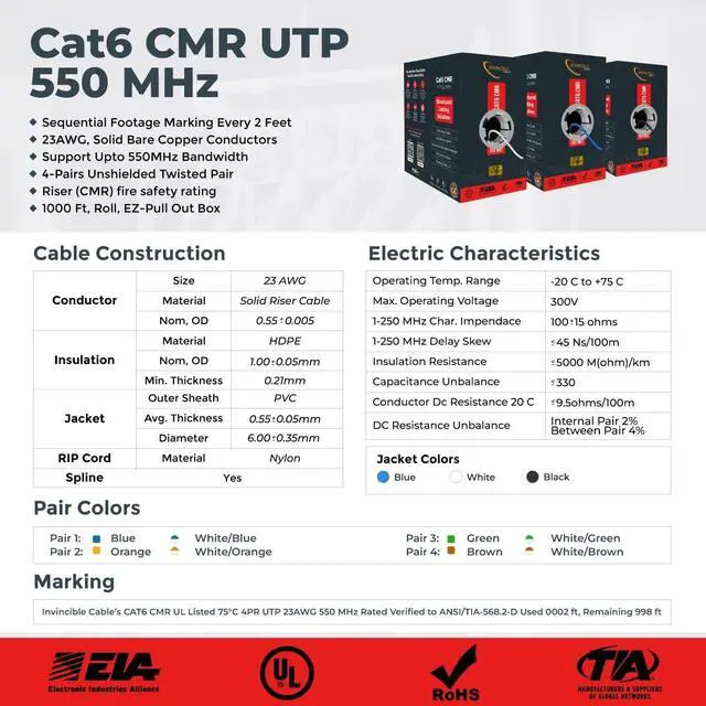 ^^ - - -: Simplify your installation process with our Cat6 riser-rated Ethernet cable, packaged in a tangle-free, easy pull box. Featuring easily identifiable color-striped 4-pair UTP (Unshielded Twisted Pair) solid copper conductors and sequential footage markings, this cable ensures precise usage tracking and smooth, flexible installation in any setting.