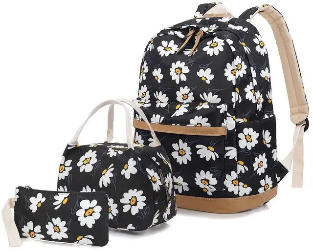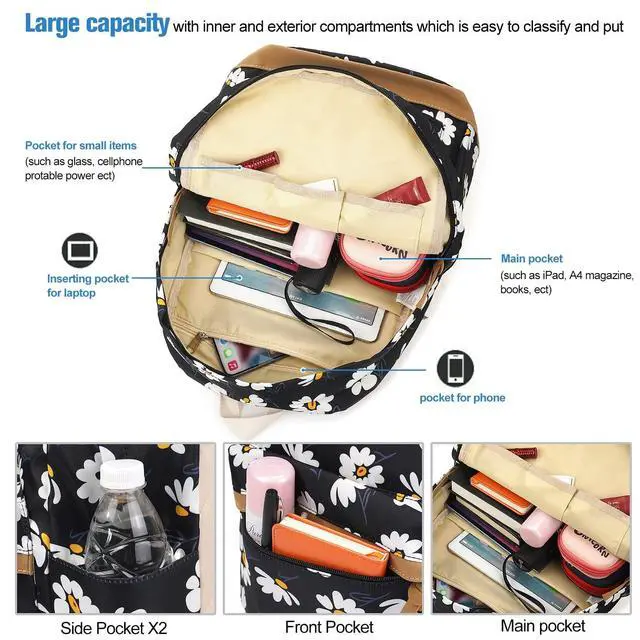 DescriptionJunlion School Bag Set 3 in 1 ( Flowers Backpack + Lunch Bag + Pencil Case)Backpack Structure1* main compartment includes 1* padded laptop compartment, 3* inside small open pockets, 1* inside zipper pocket. The main compartment could fit notebooks, magazines, A4 files. The padded laptop compartment for 14 inch laptop. The inside small open pockets for storing a mobile phone or small electronics. The inside zipper pocket for bank card and other valuables. 1* front zipper pocket, perfect for a briefcase or snack. 2* side pockets, can carry a water bottle and an umbrella.