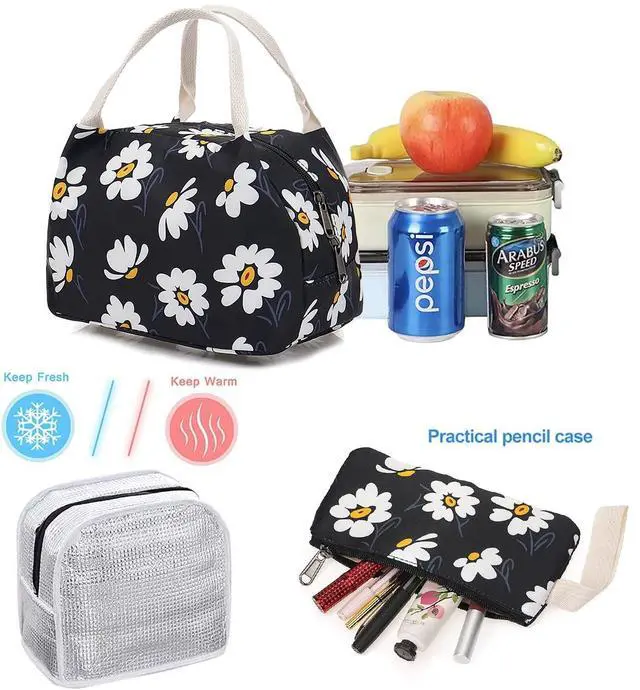 Insulated lunch bag, available to put two lunch boxes and fruits inside. The small pencil case could put pens, keys, also can be used as clutch bag, a wallet or pencil kit.