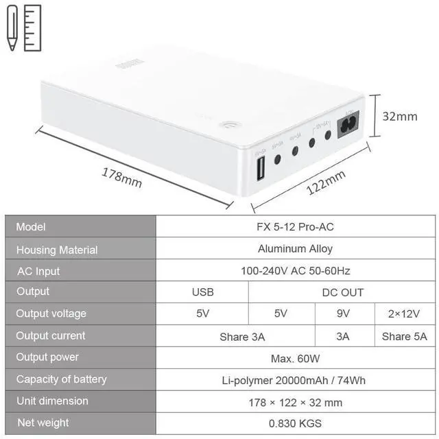No Standalone lithium batteries are sold with the product. ^^ Mini uninterrupted power supply for power outage, compatible with router, modem, security camera, telephone, fax, printer, fingerprint recorder, LED strip lights, ect, and can still use the network in case of power outage. ^^ Alumimum alloy housing, Output maximum 60W, 15V USB, 15V DC, 19V DC, 212V DC, can support router and modem at the same time. ^^ Built-in 20000mAh (74Wh) batterypack with a standard USB output, can be used as a normal power bank as well.