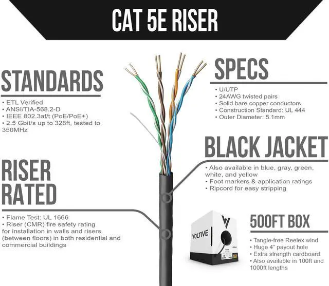 Voltive Cat5e Ethernet Cable, Riser (CMR), Black, 500ft - 24AWG 4 Pair Solid Bare Copper, UTP, 350MHz, UL Certified & ETL Verified - V-1226-3