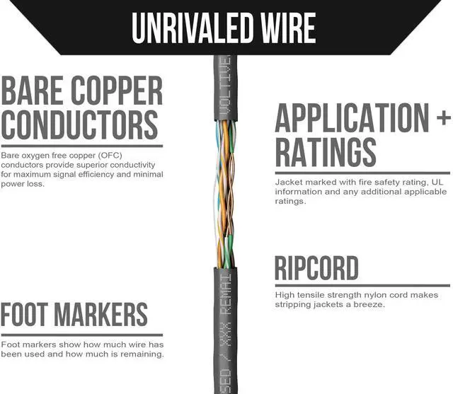CAT 5E NETWORK CABLE. 24 gauge, 4 pair, solid copper conductors, unshielded (UTP). 1 Gigabit and 2.5 Gigabit speeds up to 328ft. ETL Verified. Tested to 350MHz. PoE, PoE+, & 4PPoE/PoE++. ^^ OXYGEN-FREE COPPER. Oxygen-free copper (OFC) conductors result in less signal loss and are more durable than conductors made of copper-clad aluminum (CCA). ^^ RISER RATED. Riser (CMR) fire safety rating for installation in walls and risers (between floors) in both residential and commercial buildings. UL Certified/Listed. ^^ STANDARDS.
