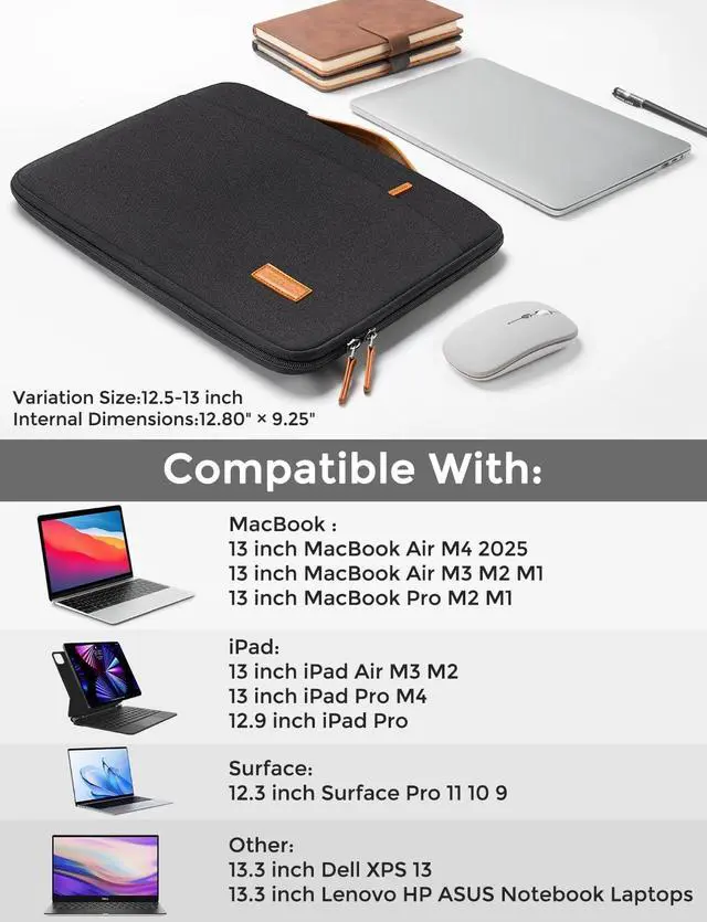 • INTERNAL DIMENSIONS: 13.4*10*1.0 inches; Perfectly fits 14-inch New MacBook Pro M4/M3/M2/M1 Pro/Max A3112 A3401 A3185 A2992 A2918 A2779 A2442 2024-2021;13.5-inch Surface Laptop 6/5/4/3, 13.8-inch New Surface Laptop 7th Edition, Copilot+ PC 2024.Also compatible with 13-inch Surface Pro 11(Copilot+PC)/10/9/8/X with Surface Pro Flex Keyboard,and most 13-13.3 inch laptops notebook from Dell, Lenovo, HP, Asus.
