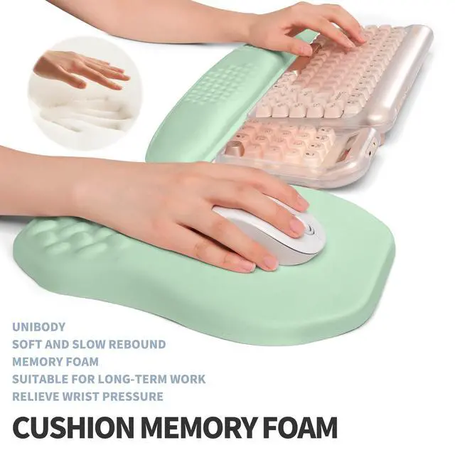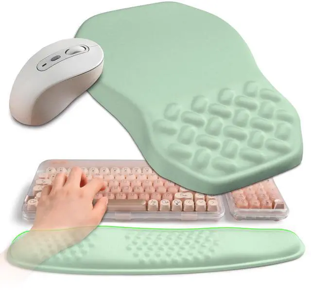Ergonomic SetWave Keyboard Wrist Rest x1( 17.1 x 3.7 inch, 435x95mm) and Massage Slope Mouse Pad Wrist Support x1( 11.8 x 7.9 inch, 300x200mm), ergonomic curvature design optimization, more in line with the natural position of the shoulder during work, alleviates carpal tunnel syndrome and wrist pain ^^ Wave and SlopThe unique wave curve adjusts the height difference between the wrist and the keyboard. The 165 double-slope mouse pad closely fits the wrist curve support, adjusts the joint and wrist posture, relieves the pressure on the elbows and shoulders during long-term work, and keeps you in the most comfortable state ^^ High Density Smooth FabricHigh density abrasion resistance smooth fabric, easy to slide and improve cursor signal reflection accuracy, accurately capturing sensor displacement distance and precise positioning ^^ Unibody Memory FoamAdopting the pressure integrated molding process, it has the advantages of strong support and slow rebound, soft and comfortable, and will not collapse during long-term use ^^ Micro Stick PU BaseThe base is made of anti slip PU material with slight adhesive properties, firmly attached to the desktop to prevent accidental movement of the mouse pad and ensure that the mouse slides freely