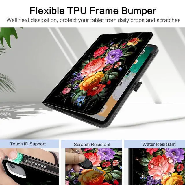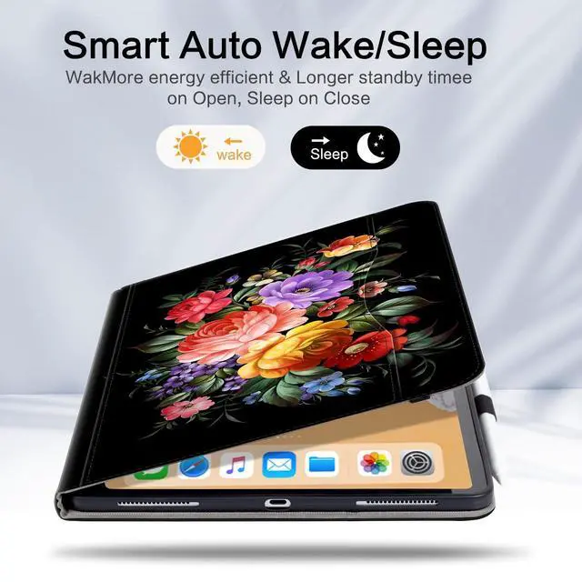 FlowersMaterial: Faux Leather, Microfiber LiningMain FeaturesAdjustable Multi Viewing StandWith three anti-slip stripes, you can adjust iPad Air 13 Inch Case in multiple angles to suits your need, for getting better experience on viewing, typing, watching and reading. Smart Auto Wake/SleepiPad Pro 12.9 Inch Case instantly wakes up tablet when opened, and makes it go to sleep when closed to extend batteries life & standby time. Humanized Hand StrapBuilt-in hand strap, coupled with an elastic band to keep the case open, give you a comfortable single-hand using experience. Elastic BandWhen you don't use it, strap help you more firmer to fix your tablet. Do not have to worry about loss and loose. Extra Front PocketDesigned for you to store personal business cards, cash, bank cards, notes or bills while going travelling. Stylus LoopMore convenient for you to save and take out your Apple Pencil (Pencil is Not Included) About Lokigo StoreProducts from Lokigo Store come with quality assurance for one year. Any quality issues well make it right for you, your request will be responded within 24 hours.